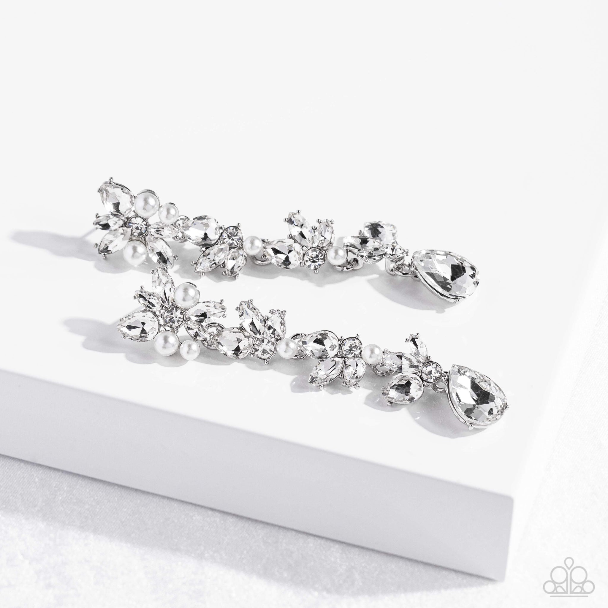 Radiant clusters of white reflective teardrop, marquise-cut and round gems combine with classic white pearls to create an explosion of glitz that extends down the ear. Hanging from the bottom of the light-reflecting earring, a white, reflective teardrop gem swings for some eye-catching shimmer against a backdrop of high-sheen silver. Earring attaches to a standard post fitting.