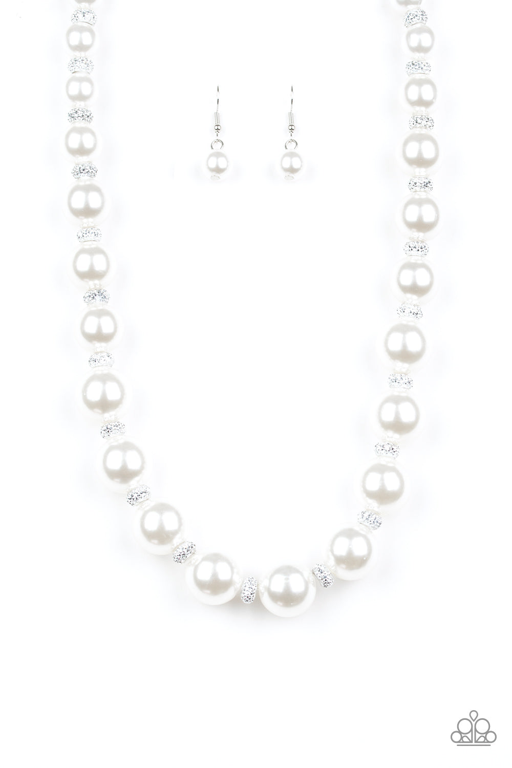 Infused with dainty silvery rhinestone encrusted beads, a refined collection of oversized white pearls are threaded along an invisible wire below the collar for a timeless dazzle. Features an adjustable clasp closure.