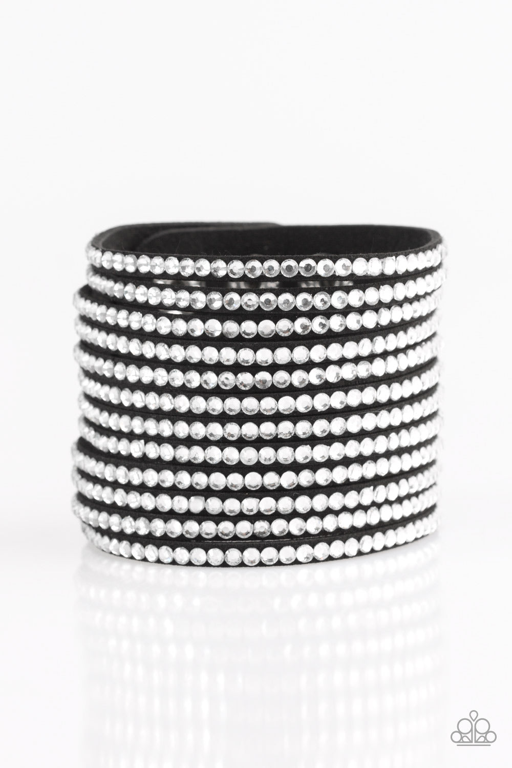 A thick black suede band is spliced into various strands. Glassy white rhinestones are sprinkled across the strands, creating blinding shimmer around the wrist for a knockout look. Features an adjustable snap closure.